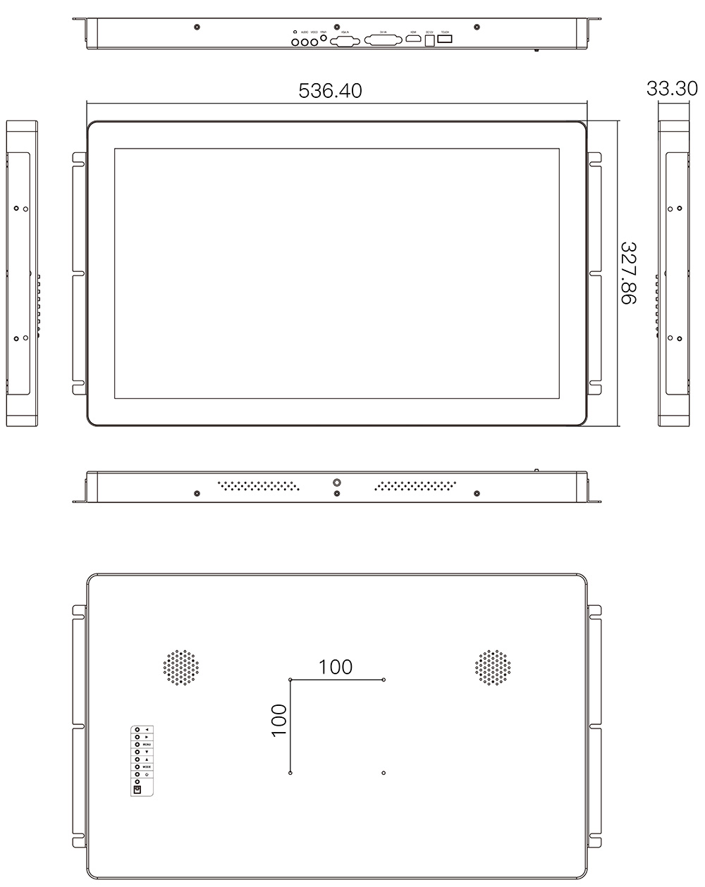 支持嵌入式、壁掛式等多種安裝方式,方便在各類(lèi)行業(yè)中靈活應(yīng)用。 (配送的掛耳可滿(mǎn)足您嵌入式安裝的需求,標(biāo)準(zhǔn)螺絲孔距VESA 100x100mm可支持壁掛式安裝)