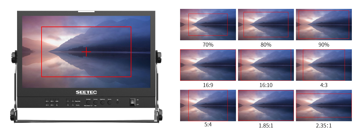 防止播放時掃描溢出,導(dǎo)致不該被切的畫面而被切掉。監(jiān)視器設(shè)有多種畫幅安全框標(biāo)記( 70%、80%、90%、16:9、16:10、4:3、5:4、1.85:1、2.35:1、自定義) 和拍攝標(biāo)記線和十字中心線。保障穩(wěn)定可靠的拍攝高效進行,滿足多樣化的后期裁剪需求。用戶可以根據(jù)不同拍攝背景色調(diào)靈活選擇標(biāo)記線顏色(黃色、青色、紫色、紅色, 綠色, 藍(lán)色, 黑色, 白色)。