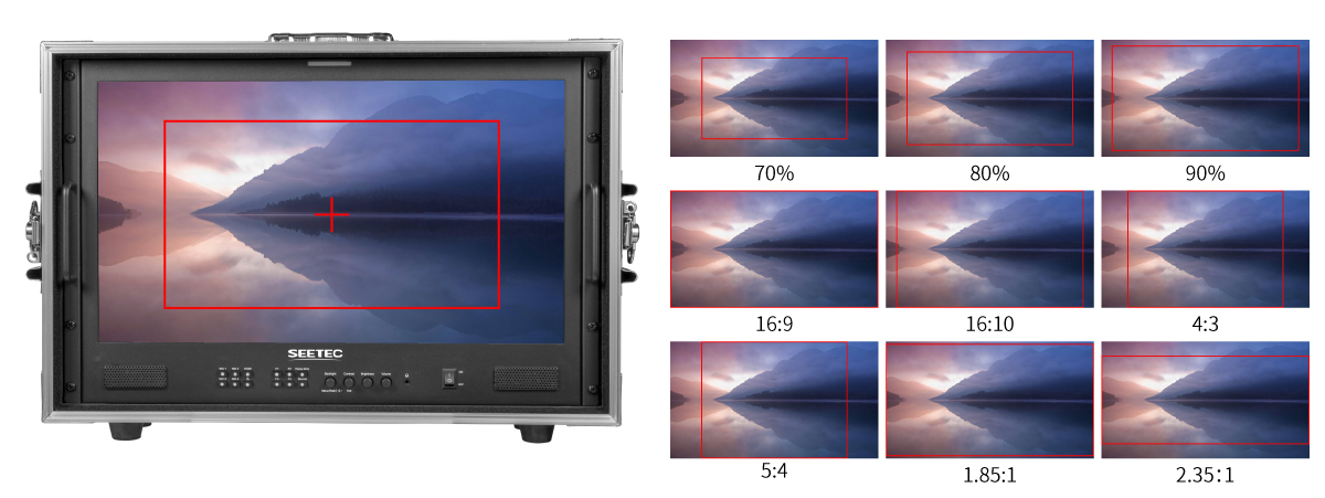 防止播放時掃描溢出,導致不該被切的畫面而被切掉。監視器設有多種畫幅安全框標記( 70%、80%、90%、16:9、16:10、4:3、5:4、1.85:1、2.35:1、自定義) 和拍攝標記線和十字中心線。保障穩定可靠的拍攝高效進行,滿足多樣化的后期裁剪需求。用戶可以根據不同拍攝背景色調靈活選擇標記線顏色(黃色、青色、紫色、紅色, 綠色, 藍色, 黑色, 白色)。
